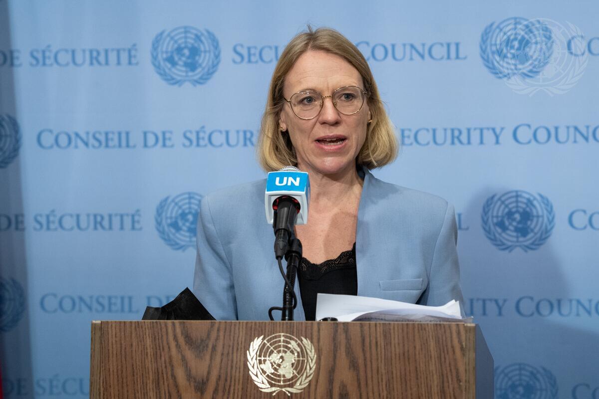 Anniken Huitfeldt, Minister for Foreign Affairs of Norway, briefs reporters ahead of the Security Council briefing on refugees.