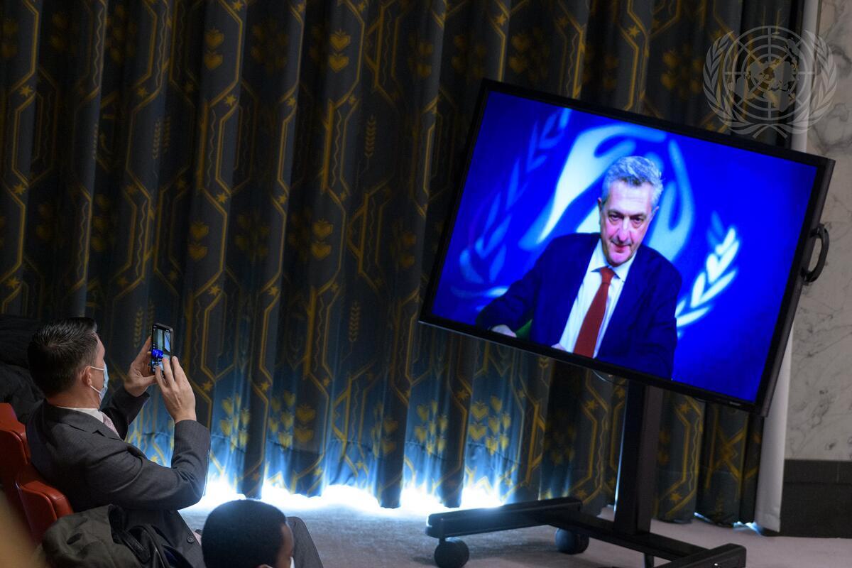 Security Council hears a briefing by Filippo Grandi (on screen), United Nations High Commissioner for Refugees.