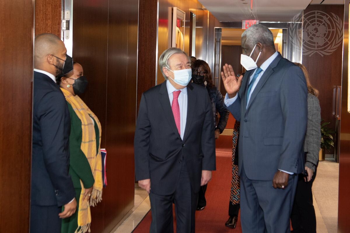 Secretary-General António Guterres (centre) meets with Moussa Faki Mahamat, Chairperson of the African Union Commission.
