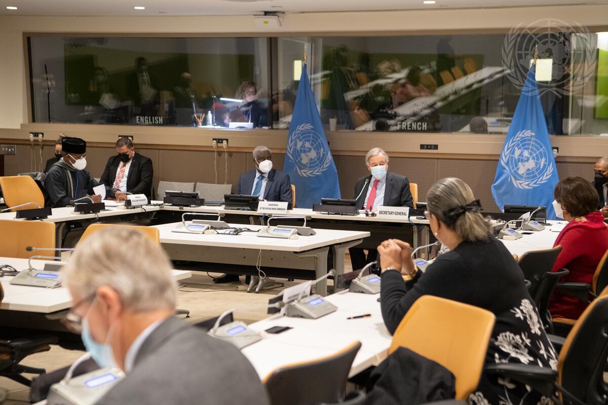 Secretary-General António Guterres (right at far end of table) and Moussa Faki Mahamat, Chairperson of the African Union Commission, attend a plenary meeting of the Fifth African Union-United Nations Annual Conference.