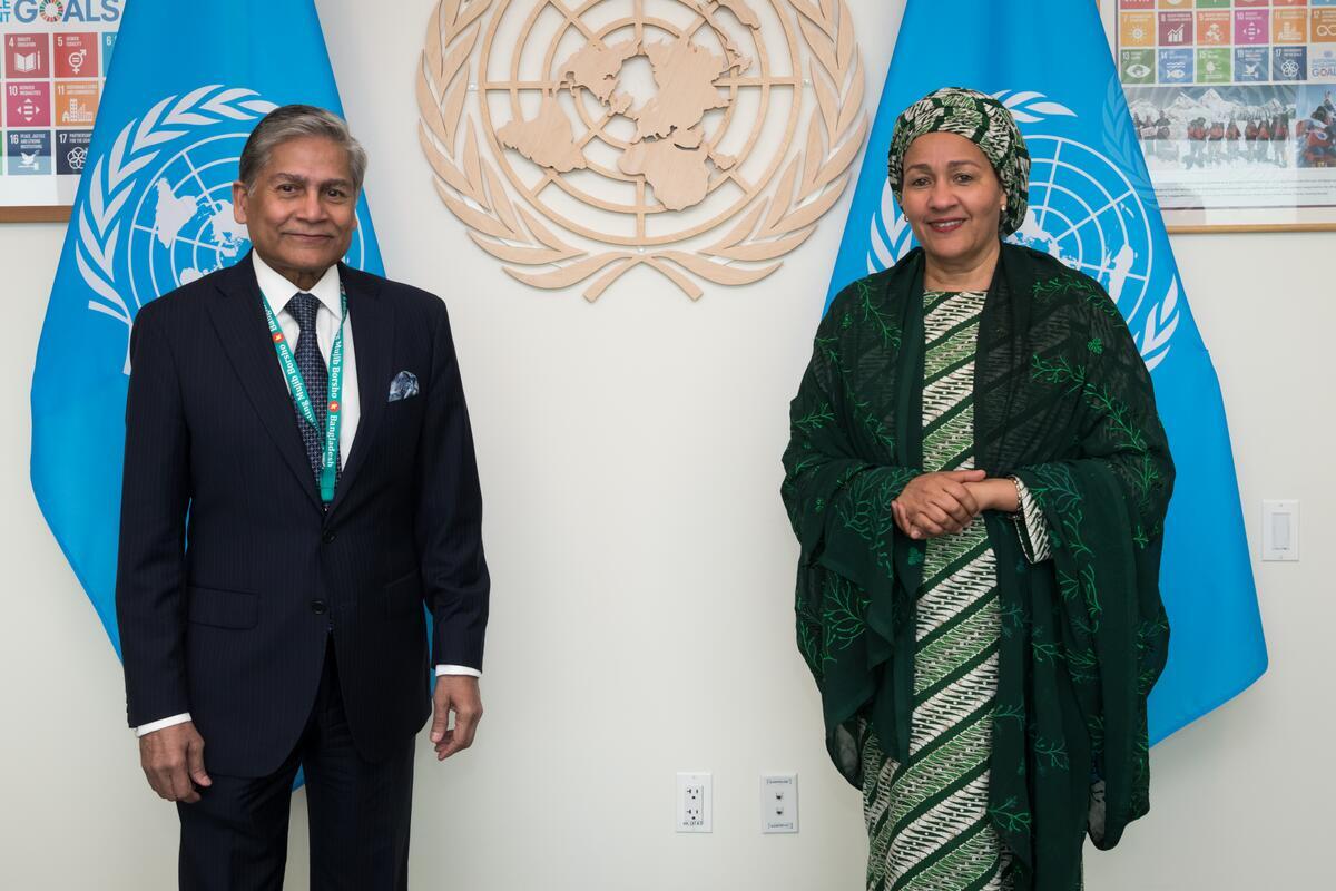 Deputy Secretary-General Amina Mohammed (right) meets with Mohammad Ziauddin, Ambassador at large to the Prime Minister of Bangladesh and leader of Bangladesh delegation to the General Assembly High Level meeting on Financing for Peacebuilding.