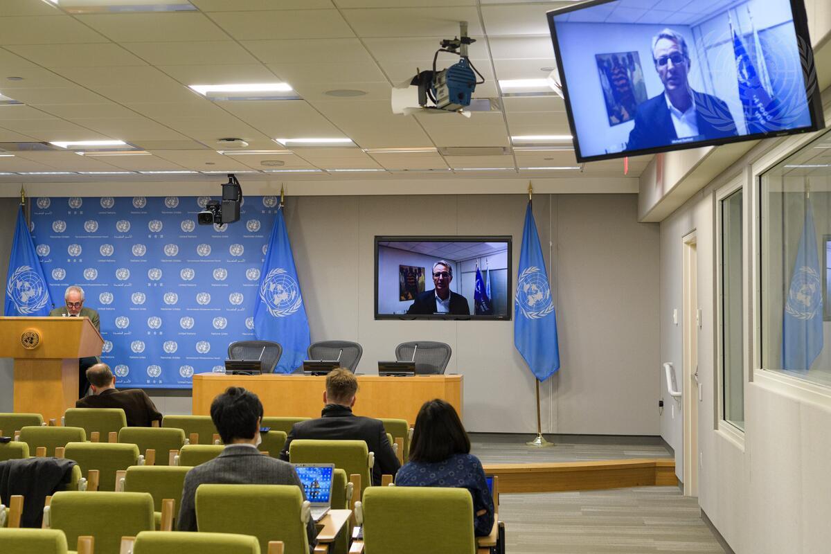 Michael Dunford (on screen), World Food Programme's (WFP) Regional Director for East Africa, briefs reporters on the drought in the Horn of Africa. He is briefing remotely from Nairobi.