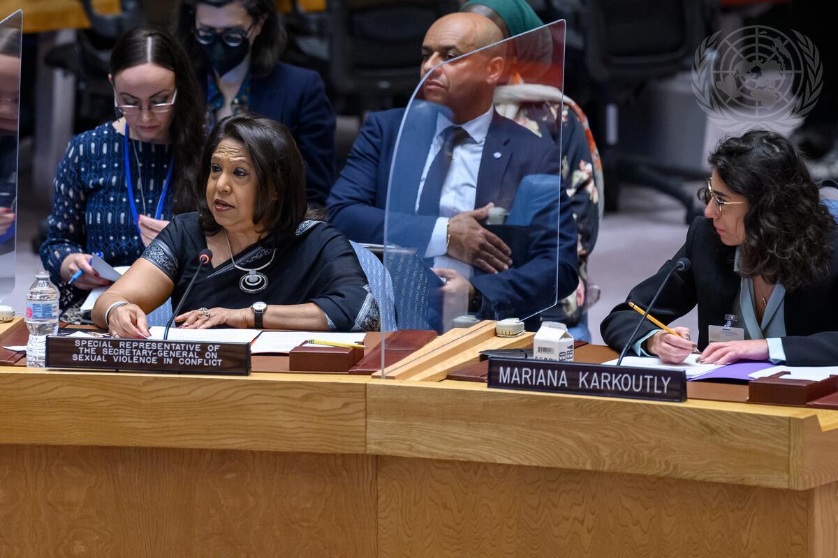 Pramila Patten (left), Special Representative of the Secretary-General on Sexual Violence in Conflict, briefs the Security Council meeting on women and peace and security.