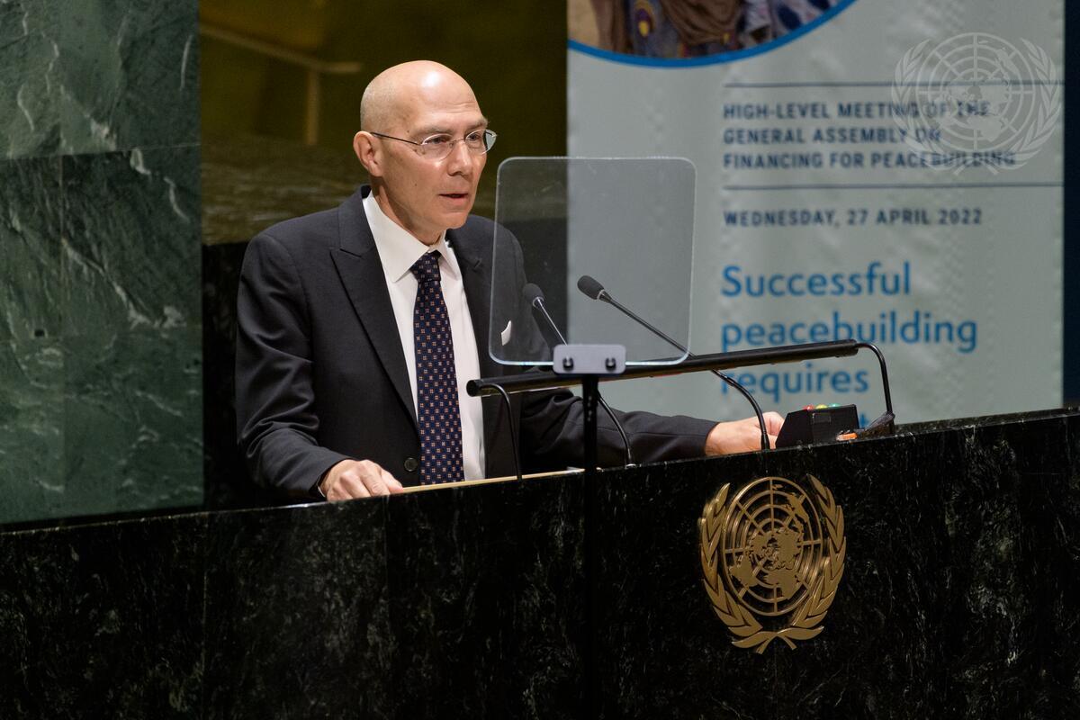 Volker Türk, Under-Secretary-General for Policy of the Executive Office of the Secretary-General, addresses the General Assembly high-level meeting on Peacebuilding Financing. The meeting offers the platform for Member States to discuss how to advance, explore and consider options for ensuring adequate, predictable and sustained financing for peacebuilding.