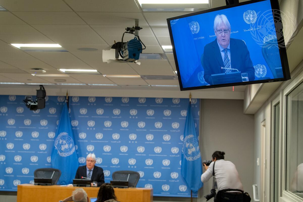 Martin Griffiths (on screen and at dais), Under-Secretary-General for Humanitarian Affairs and Emergency Relief Coordinator, briefs reporters on the humanitarian situation in Ukraine.