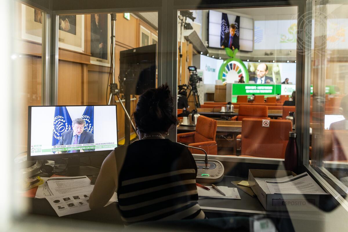 A view through an interpreter's booth as Guy Ryder (on screen), Director General of the International Labour Organization (ILO), addresses the meeting/
