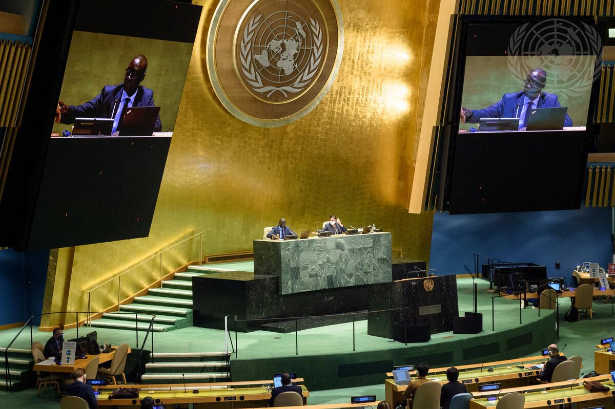 Issa Konfourou (on screens and left at dais), Permanent Representative of the Republic of Mali to the United Nations, chairs the General Assembly meeting.
