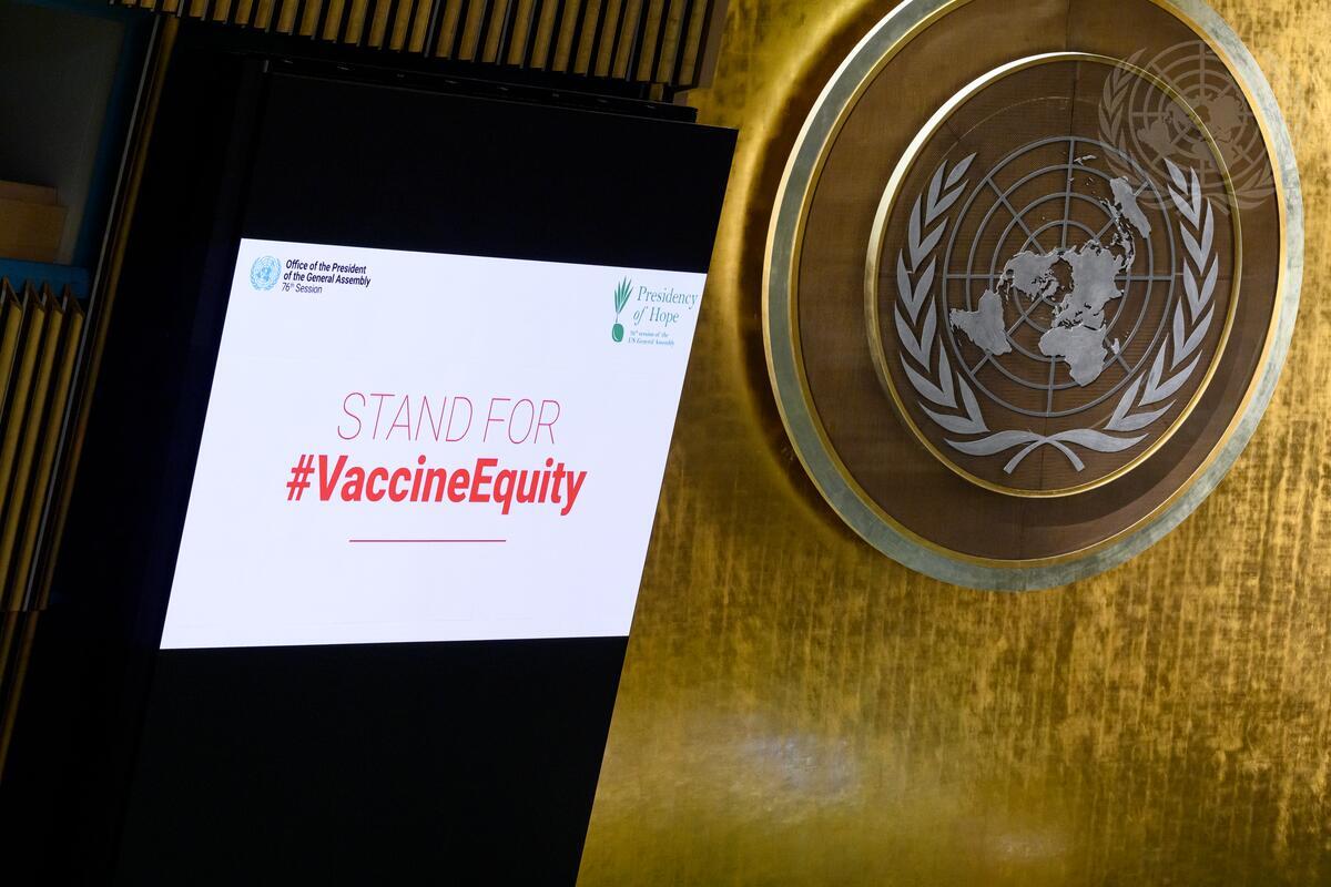 A view of the screen with text saying "Stand for Vaccine Equity" the General Assembly high-level thematic debate on “Galvanizing momentum for universal vaccination”.