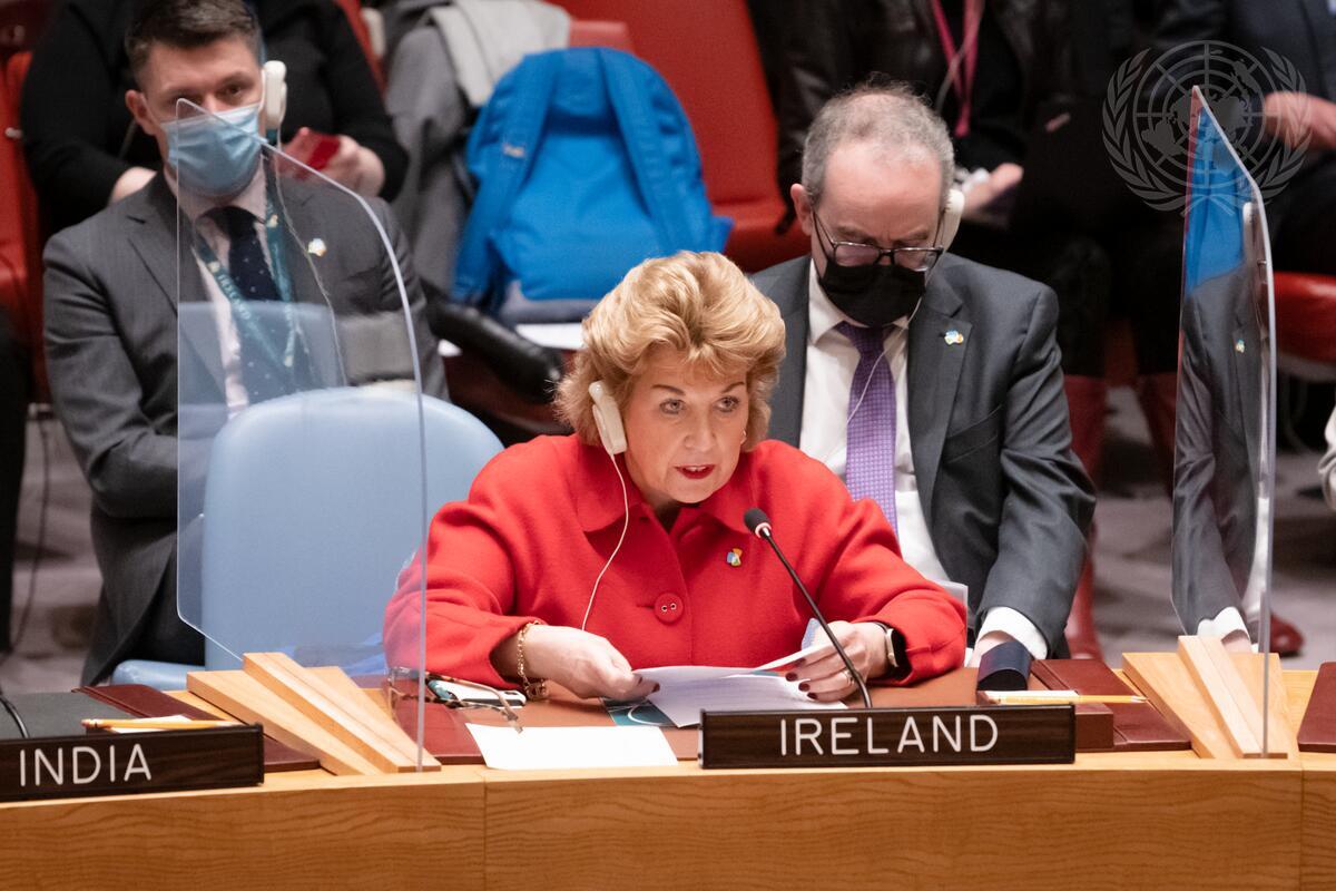 Geraldine Byrne Nason, Permanent Representative of Ireland to the United Nations, addresses the emergency Security Council meeting on the current situation in Ukraine.