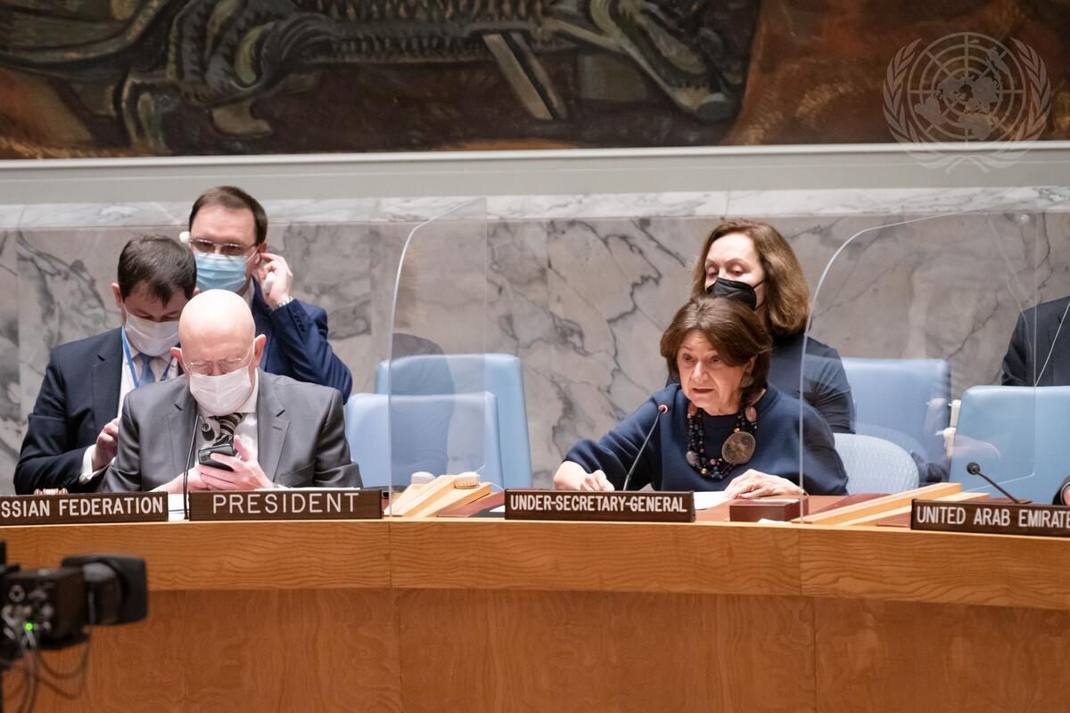 Rosemary DiCarlo (right), Under-Secretary-General for Political and Peacebuilding Affairs, addresses the emergency Security Council meeting on the current situation in Ukraine.