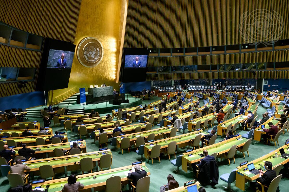 A wide view of the General Assembly Hall as Abdulla Shahid (at podium and on screens), President of the seventy-sixth session of the United Nations General Assembly, addresses the General Assembly high-level thematic debate on “Galvanizing momentum for universal vaccination”.