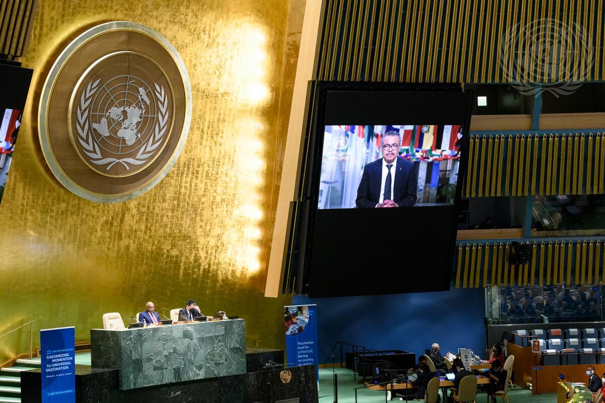 Tedros Adhanom Ghebreyesus (on screen), Director-General of the World Health Oragnization (WHO), addresses the General Assembly high-level thematic debate on “Galvanizing momentum for universal vaccination”.