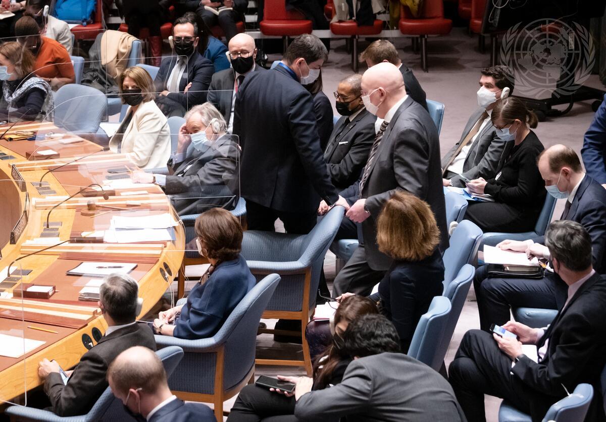 Vassily Nebenzia (standing centre). Permanent Representative of the Russian Federation to the United Nations and President of the Security Council for the month of February, returns to the table during the emergency Security Council meeting on the current situation in Ukraine.