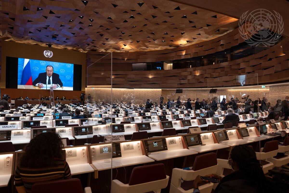 A view of delegates leaving the room as Sergey V. Lavrov (on screen), Minister for Foreign Affairs of the Russian Federation, addresses the high-level segment of the 49th regular session of the Human Rights Council (28 February – 1 April 2022).