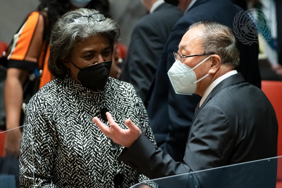 Zhang Jun (right), Permanent Representative of China to the United Nations, speaks with Linda Thomas-Greenfield, Permanent Representative of the United States to the United Nations, ahead of the Security Council meeting on the situation in Ukraine.