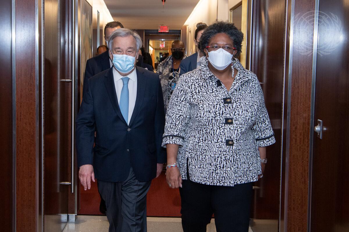 Secretary-General António Guterres (left) meets with Mia Amor Mottley, Prime Minister, Minister for National