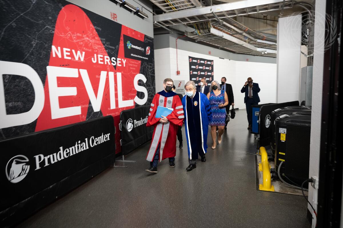 Secretary-General António Guterres (right in front) arrives to give remarks at the Seton Hall University commencement for the Class of 2022 and receives an Honorary Degree from Seton Hall.
