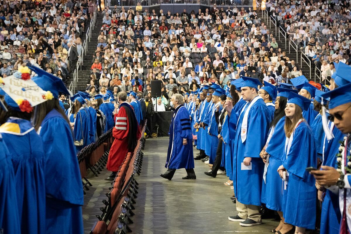 Secretary-General António Guterres (centre) arrives to give remarks at the Seton Hall University commencement for the Class of 2022 and receive an Honorary Degree from Seton Hall.