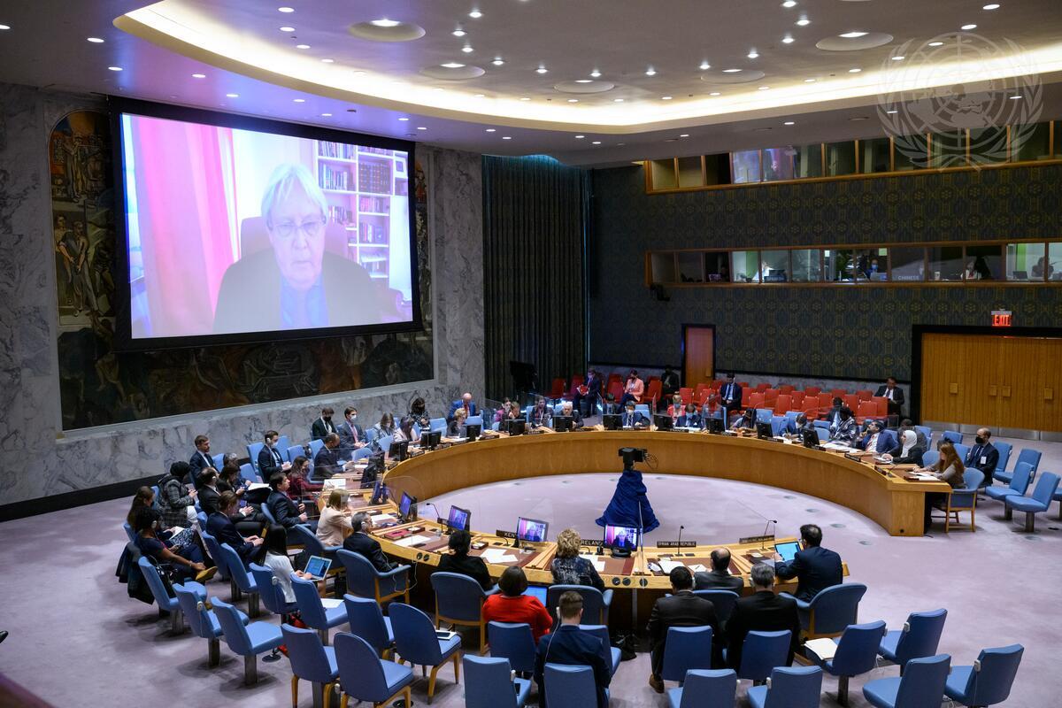 Martin Griffiths (on screen), Under-Secretary-General for Humanitarian Affairs and Emergency Relief Coordinator, briefs the Security Council meeting on the situation in the Middle East (Syria).