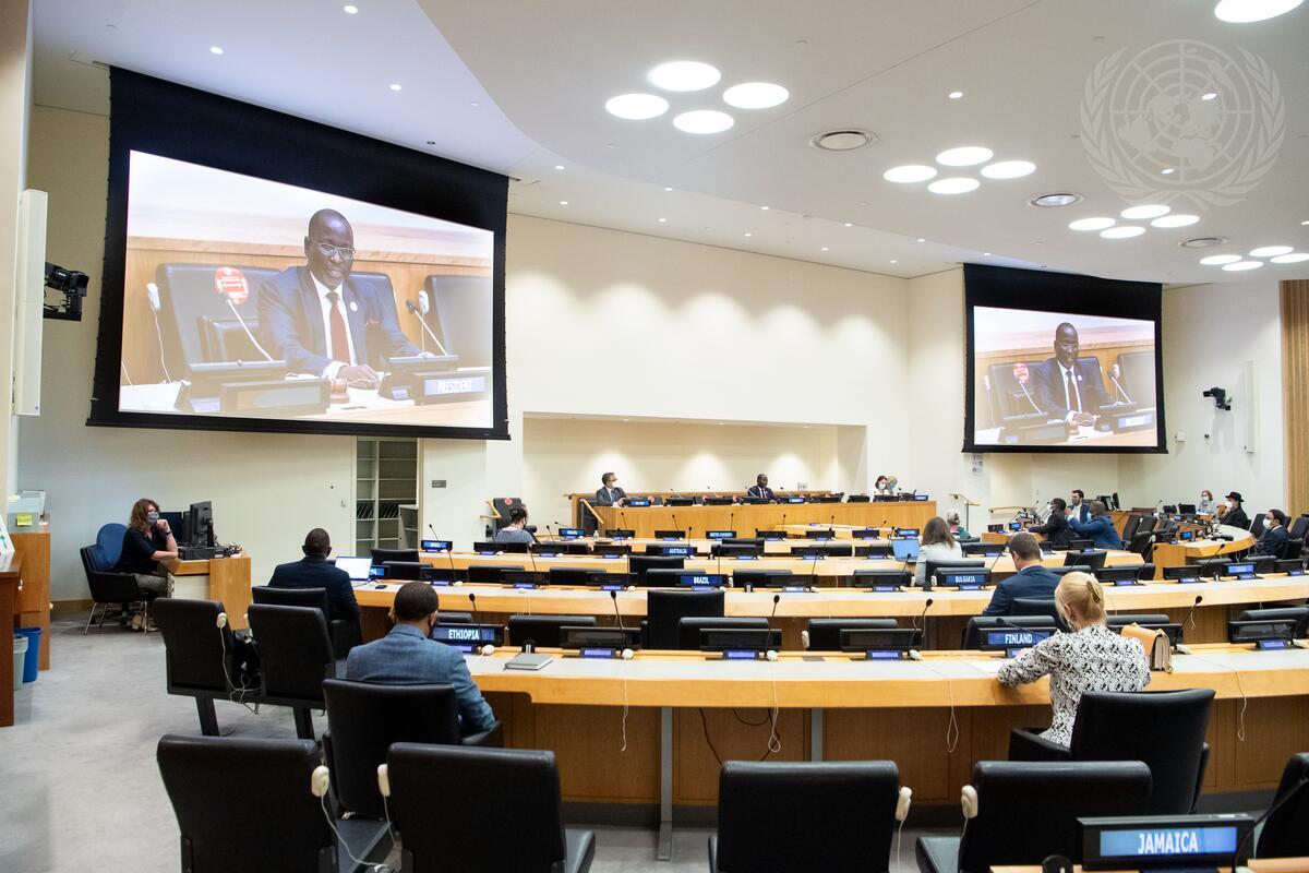 Collen Vixen Kelapile (on screens), new President of the Economic and Social Council (ECOSOC) and Permanent Representative of Botswana to the United Nations, addresses the ECOSOC plenary meeting to elect the Bureau, as well as consider the provisional agenda and the working arrangements for the 2022 session (23 July 2021 to 22 July 2022).