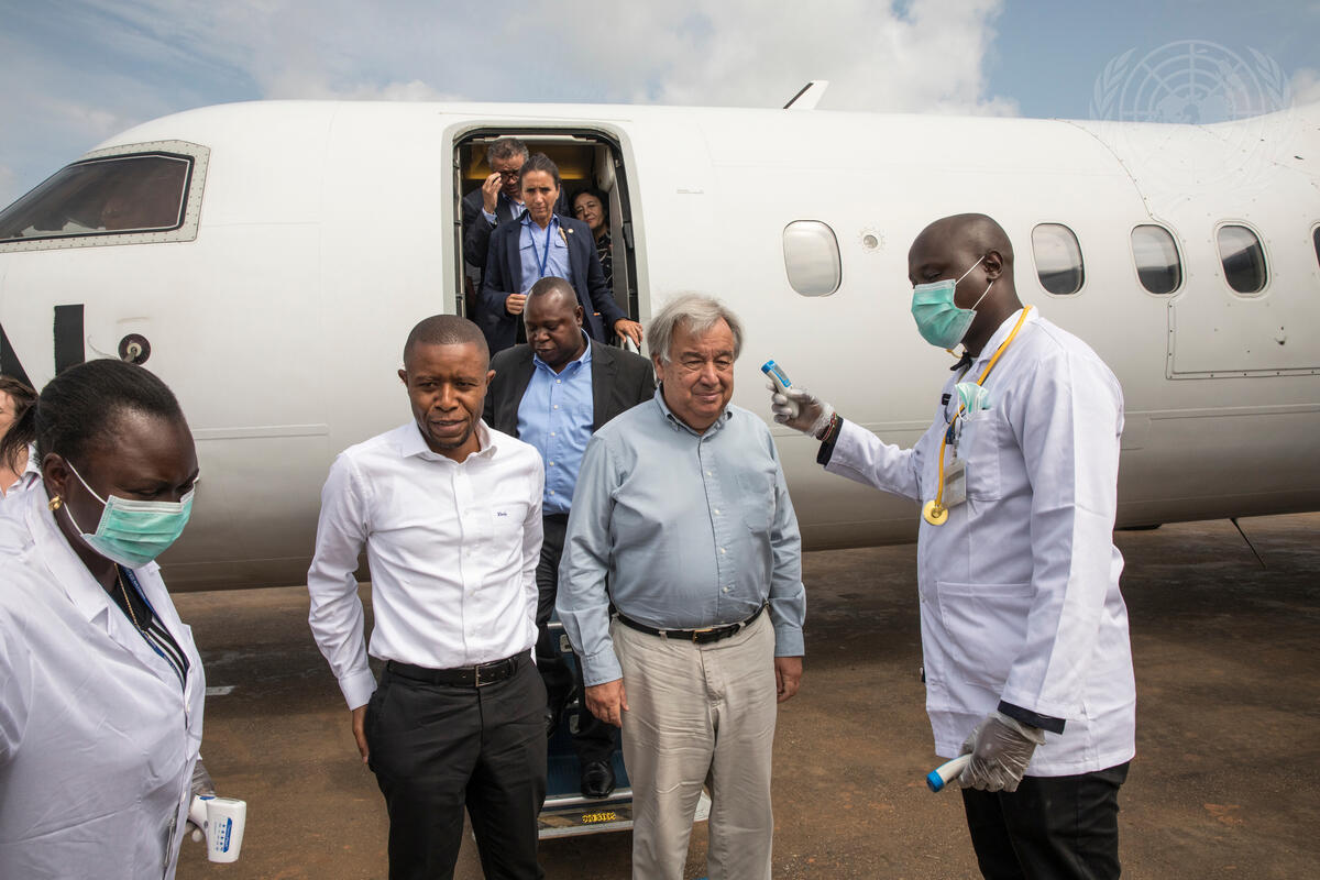 Secretary-General António Guterres (second from right) arrives at Beni Mavivi airport in the Democratic Republic of the Congo. Upon arrival, his temperature was checked by medical staff. This region is where the Ebola epidemic started 13 months ago.