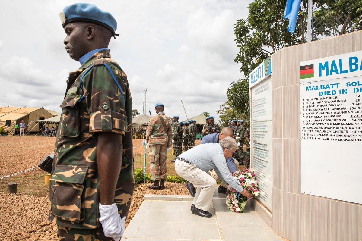Secretary-General António Guterres lays a wreath for fallen peacekeepers in Mavivi town in the eastern Democratic Republic of the Congo (DR Congo).