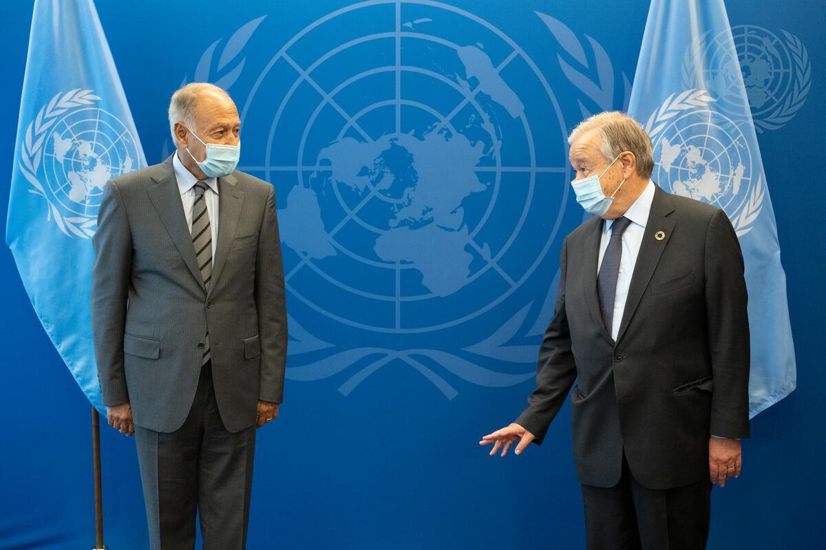 Secretary-General António Guterres (right) meets with Ahmed Aboul Gheit, Secretary-General of the League of Arab States.