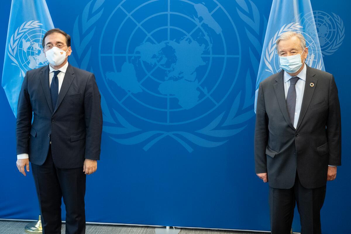Secretary-General António Guterres (right) meets with José Manuel Albares Bueno, Minister for Foreign Affairs, European Union and Cooperation of Spain.