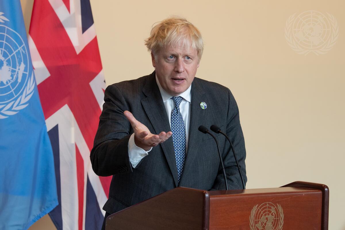 Boris Johnson, Prime Minister and First Lord of the Treasury and Minister for the Civil Service of the United Kingdom of Great Britain and Northern Ireland, briefs reporters after the Informal Leaders Round Table on Climate Change.