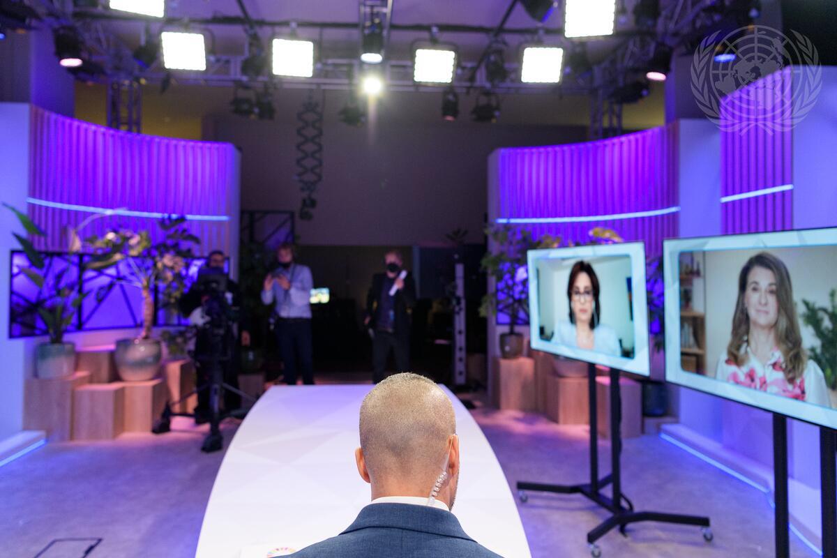 A moderated dialogue on Gender Equality Imperative is held during the Sustainable Development Goals (SDG) Moment at UN Headquarters. Participants are Sima Sami Bahous (on left screen), Executive Director Designate of UN Women, and Melinda French Gates (on right screen), Co-Chair and Trustee of the Bill & Melinda Gates Foundation. Moderator is Sherwin Bryce-Pease (with back to camera), UN Bureau Chief of the South African Broadcasting Corporation.