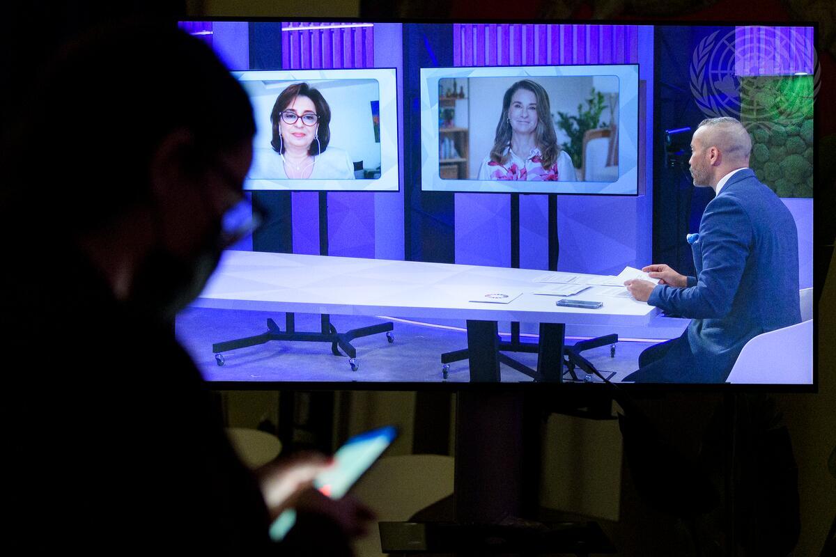 A moderated dialogue on Gender Equality Imperative is held during the Sustainable Development Goals (SDG) Moment at UN Headquarters. Participants are Sima Sami Bahous (on left screen), Executive Director Designate of UN Women, and Melinda French Gates (on right screen), Co-Chair and Trustee of the Bill & Melinda Gates Foundation. Moderator is Sherwin Bryce-Pease (seated at table), UN Bureau Chief of the South African Broadcasting Corporation.