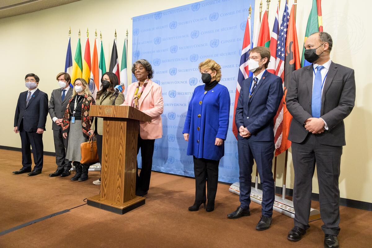 Linda Thomas-Greenfield (at podium), Permanent Representative of the United States to the United Nations, reads a statement ahead on the Democratic People’s Republic of Korea ahead of Security Council consultations on Non-proliferation/the Democratic People’s Republic of Korea. With her are the Permanent Representatives of Albania, France, Ireland, Japan, the United Arab Emirates, and Deputy Permanent Representatives of Brazil and the United Kingdom.