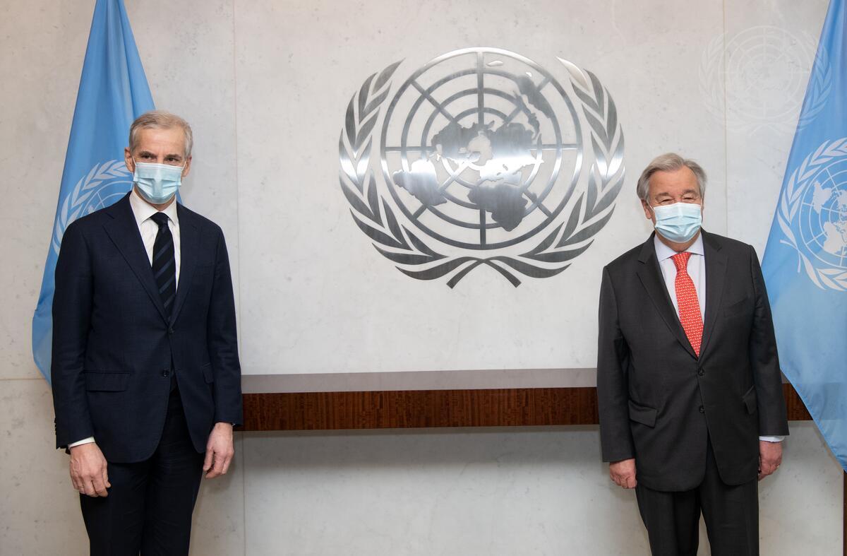 Secretary-General António Guterres (right) meets with Jonas Gahr Støre, Prime Minister of Norway.