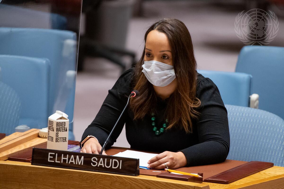 Elham Saudi, Director of Lawyers for Justice in Libya, briefs the Security Council meeting on the situation in Libya.