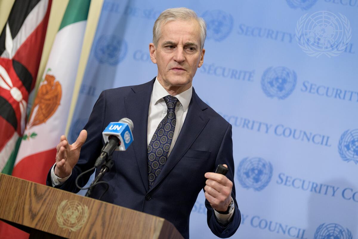 Jonas Gahr Støre, Prime Minister of Norway and President of the Security Council for the month of January, briefs reporters following the Security Council meeting on war in cities and protection of civilians in urban settings.