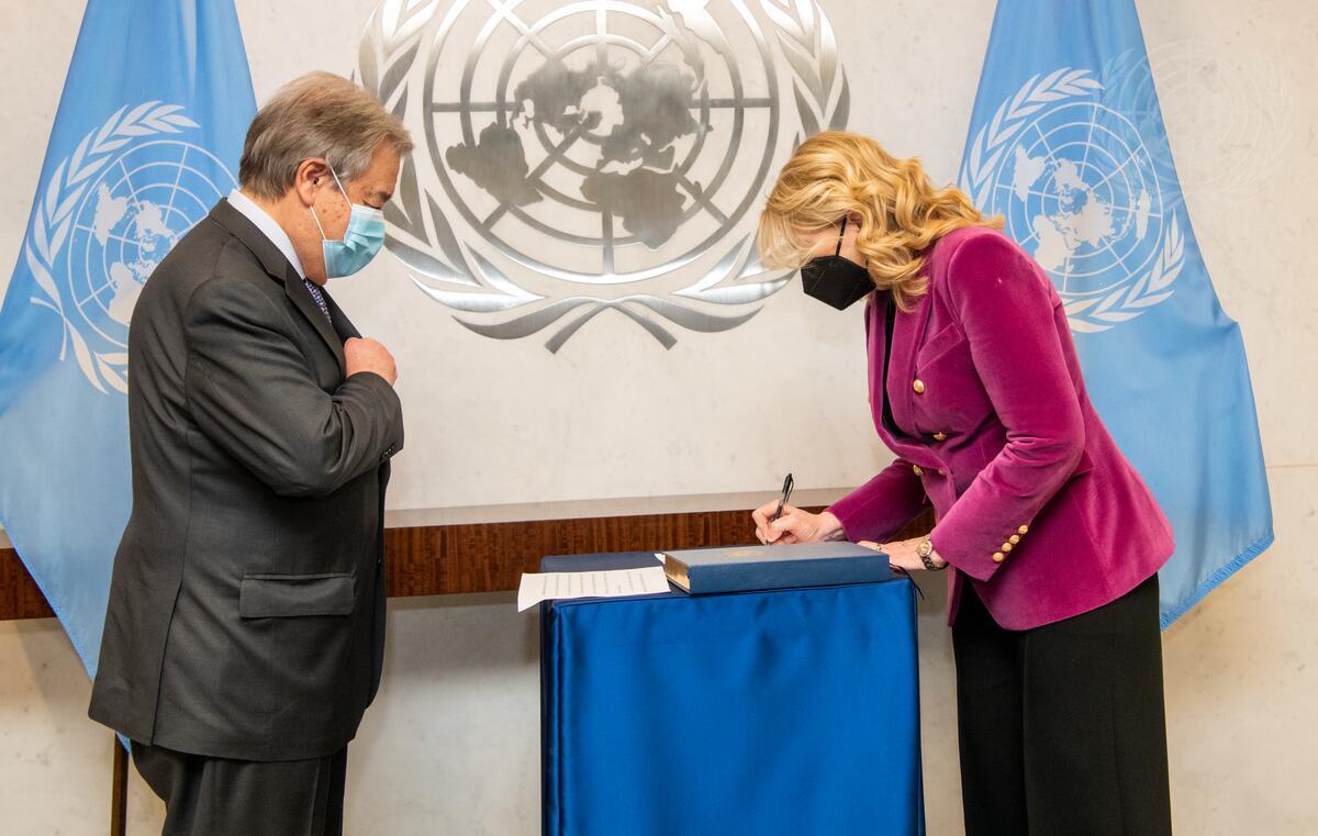 Secretary-General António Guterres (left) swears in Catherine Mary Russell, Executive Director of the United Nations Children’s Fund (UNICEF).