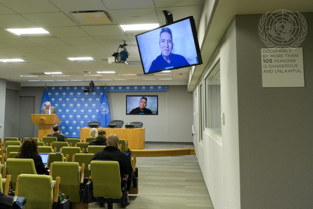 Mark Cutts, (on screen) UN Deputy Regional Humanitarian Coordinator for the Syria Crisis, briefs journalists.