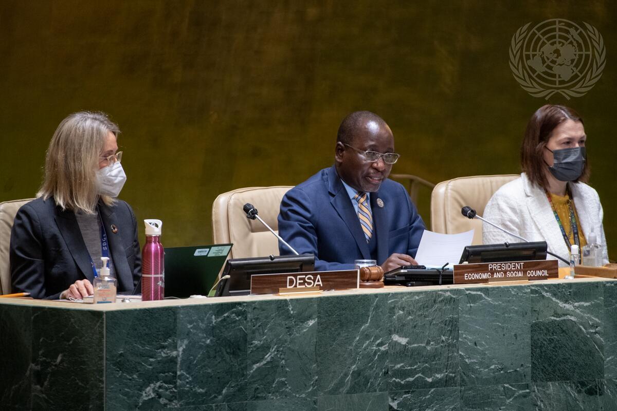 Collen Vixen Kelapile (centre), President of the Economic and Social Council (ECOSOC), chairs the Economic and Social Council Partnership Forum “Building back better from the coronavirus disease (COVID-19) while advancing the full implementation of the 2030 Agenda for Sustainable Development”.