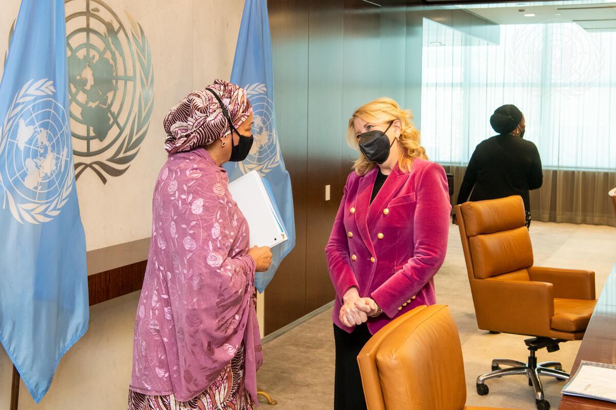 Deputy Secretary-General Amina Mohammed (left) speaks with Catherine Mary Russell, Executive Director of the United Nations Children’s Fund (UNICEF).