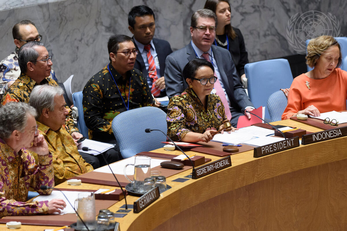 Retno Lestari Priansari Marsudi, Minister for Foreign Affairs of the Republic of Indonesia and President of the Security Council for the month of May, chairs the Security Council meeting on United Nations peacekeeping operations. The theme of the meeting was ""Investing in peace: Improving safety and performance of UN peacekeepers"". At left is Christoph Heusgen, Permanent Representative of Germany to the United Nations, and Secretary-General António Guterres. Behind the Secretary-General is Dian Triansyah Djani, Permanent Representative of Indonesia to the United Nations.