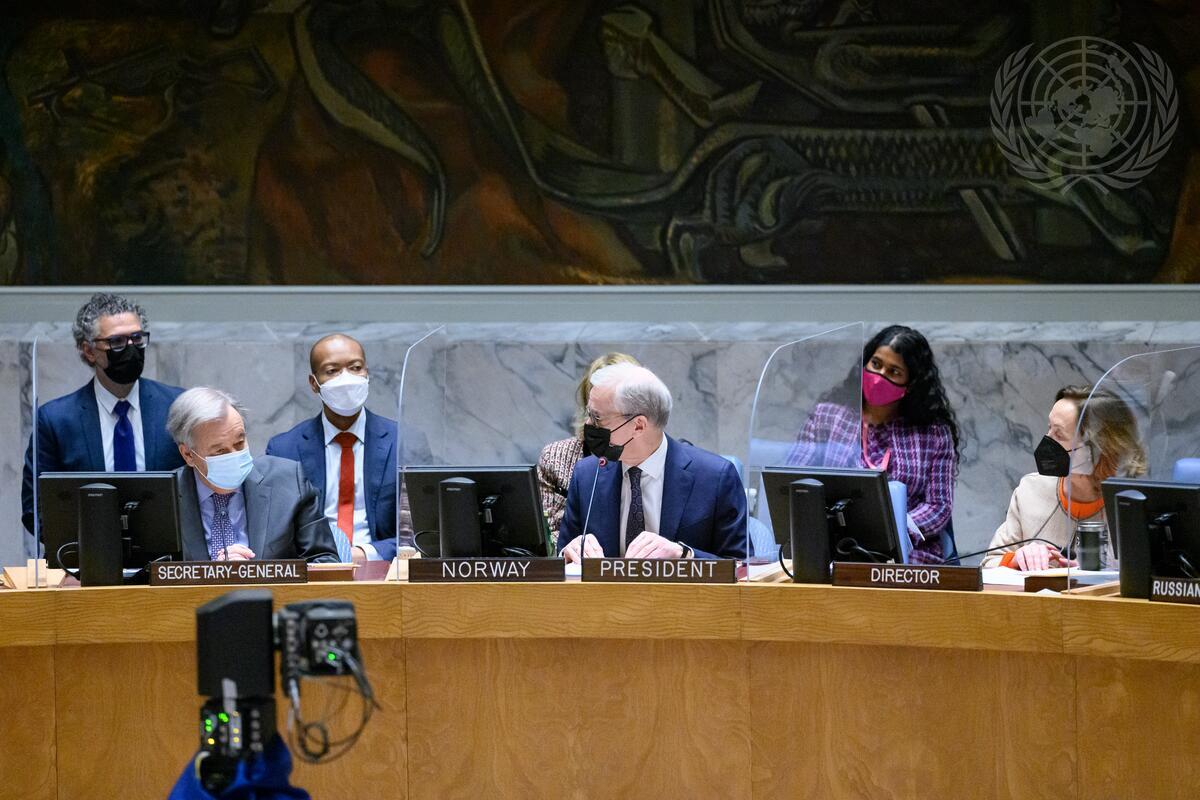Jonas Gahr Støre (centre), Prime Minister of Norway and President of the Security Council for the month of January, chairs the Security Council meeting on war in cities: protection of civilians in urban settings under the theme protection of civilians in armed conflict.