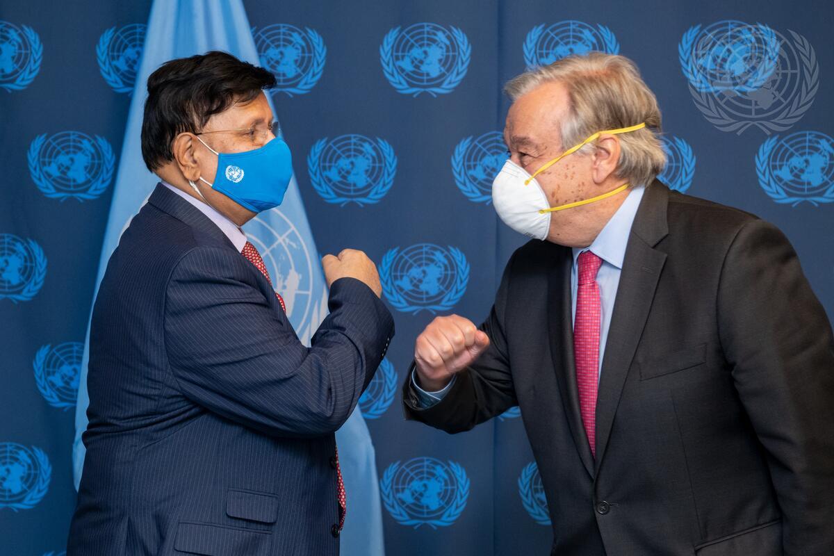 Secretary-General António Guterres (right) meets with Abdul Momen, Minister for Foreign Affairs of the People's Republic of Bangladesh.