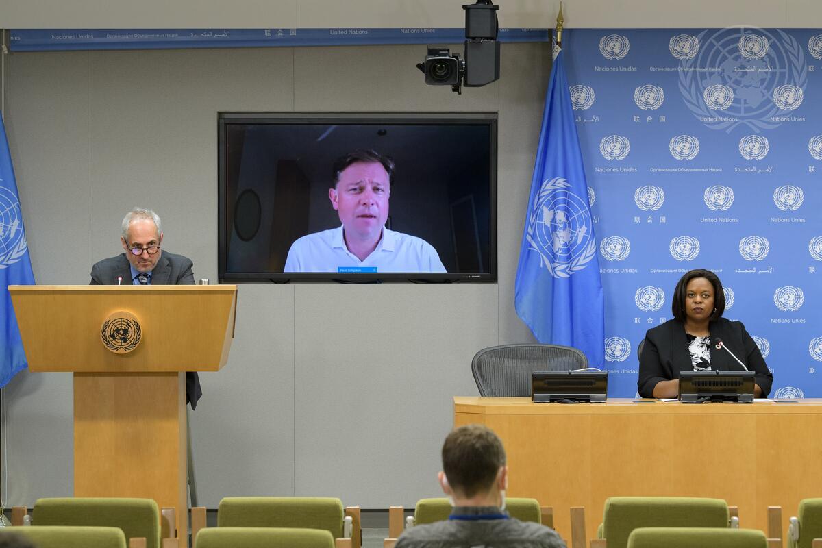 Sanda Ojiambo (at right), Executive Director of UN Global Compact, and Paul Simpson (on screen), Chief Executive Officer of CDP, brief reporters on new research from the Science Based Targets initiative (SBTi), a body enabling businesses to set ambitious emissions reduction targets. The new research reveals that none of the G7's leading stock indexes are currently aligned with a 1.5 C or 2 C pathway, and calls on the largest listed G7 companies to urgently increase climate action. At podium at left is Stéphane Dujarric, Spokesperson for the Secretary-General.
