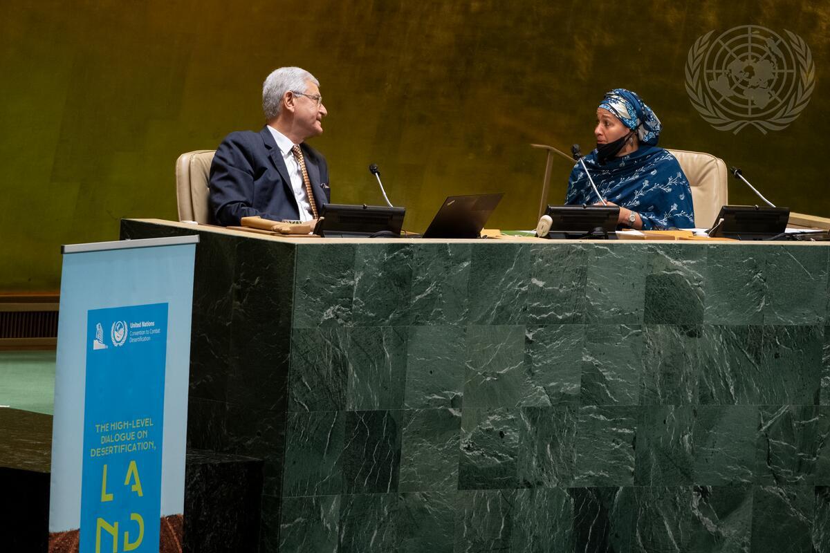Volkan Bozkir (left), President of the seventy-fifth session of the United Nations General Assembly, speaks with Deputy Secretary-General Amina Mohammed ahead of the General Assembly high-level dialogue on desertification, land degradation and drought. The dialogue is convenes by the President of the General Assembly to assess the progress made in the fight against desertification, land degradation and drought, and map the way forward in view of the end of the UN Decade for Deserts and the Fight against Desertification.