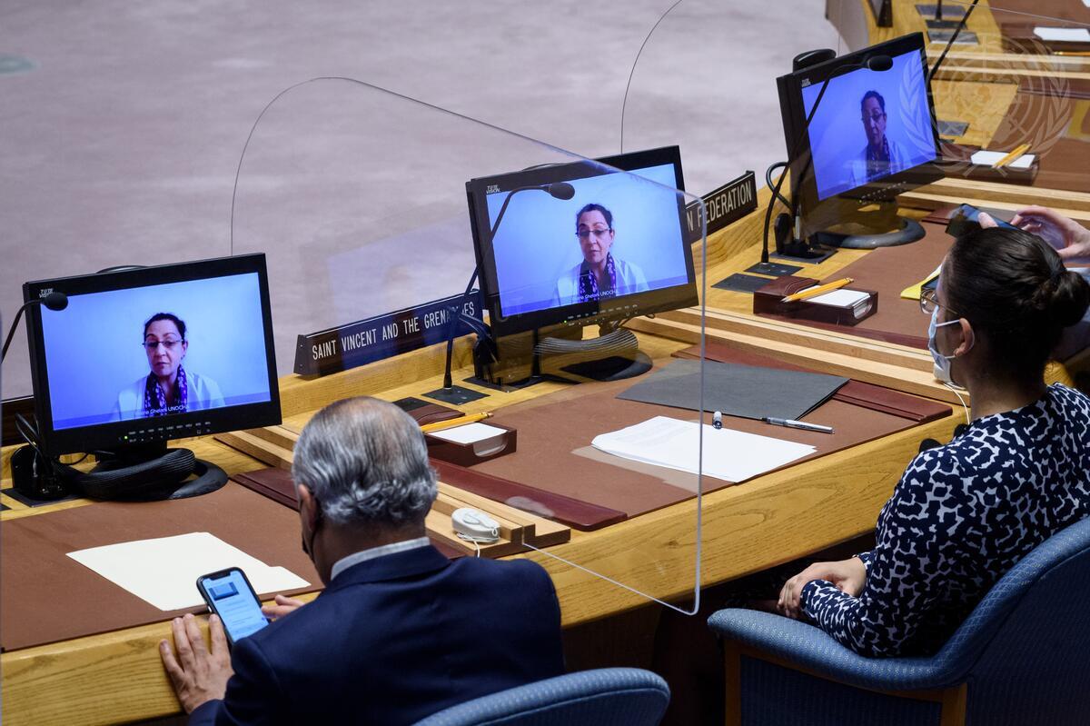 Reena Ghelani (on screens), Deputy Director of the Coordination and Response Division of the United Nations Office for the Coordination of Humanitarian Affairs, briefs the Security Council meeting on the situation in the Middle East (Yemen).