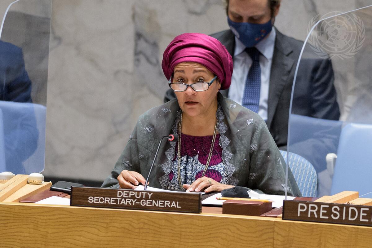 Deputy Secretary-General Amina Mohammed addresses the Security Council meeting on protection of civilians in armed conflict, with a focus on preserving humanitarian space.