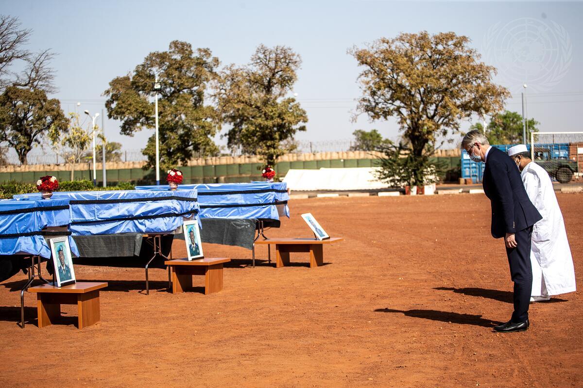 Jean-Pierre Lacroix, Under-Secretary-General for Peace Operations, and Mahamat Saleh Annadif, Special Representative of the Secretary-General and Head of the United Nations Multidimensional Integrated Stabilization Mission in Mali (MINUSMA) takes part in a ceremony for the four peacekeepers from Côte d'Ivoire who passed away during their service with MINUSMA for peace in Mali.
