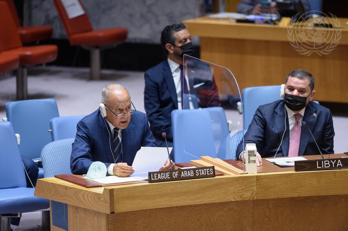 Ahmed Aboul Gheit, Secretary-General of the League of Arab States, addresses the Security Council meeting on the situation in Libya. At right is Abdul Hamid Dbeibeh, Prime Minister of the Government of National Unity of Libya.