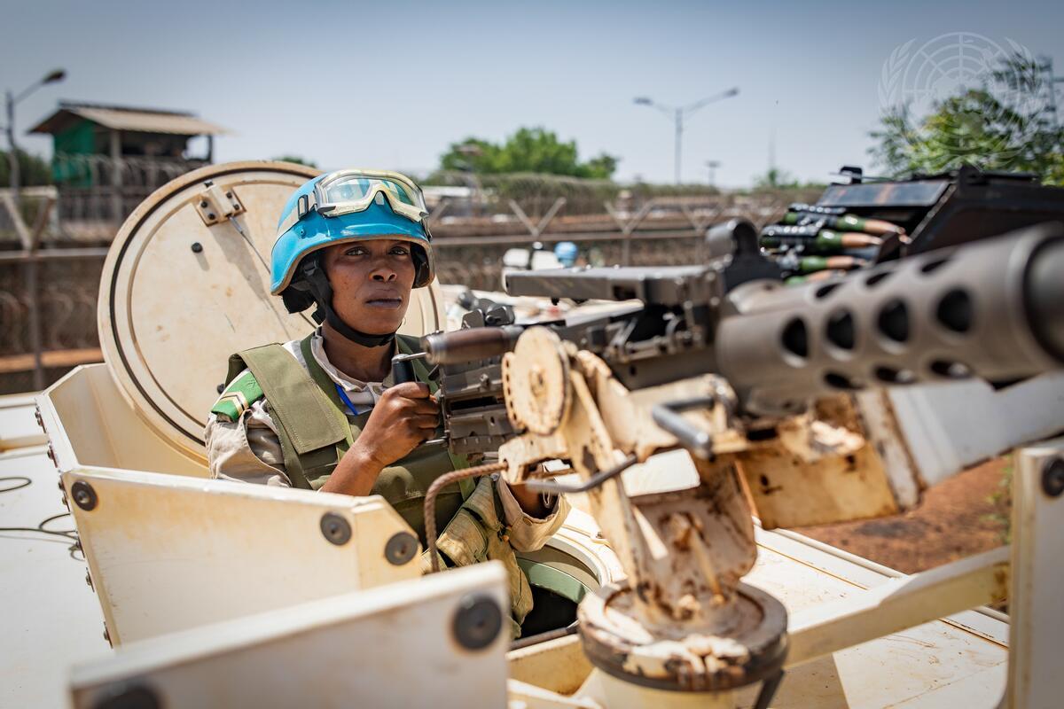 A Peacekeeper from Benin serving with the United Nations Multidimensional Integrated Stabilization Mission in Mali (MINUSMA) is in charge of securing MINUSMA infrastructure at the camp in Bamako during a simulation exercise.