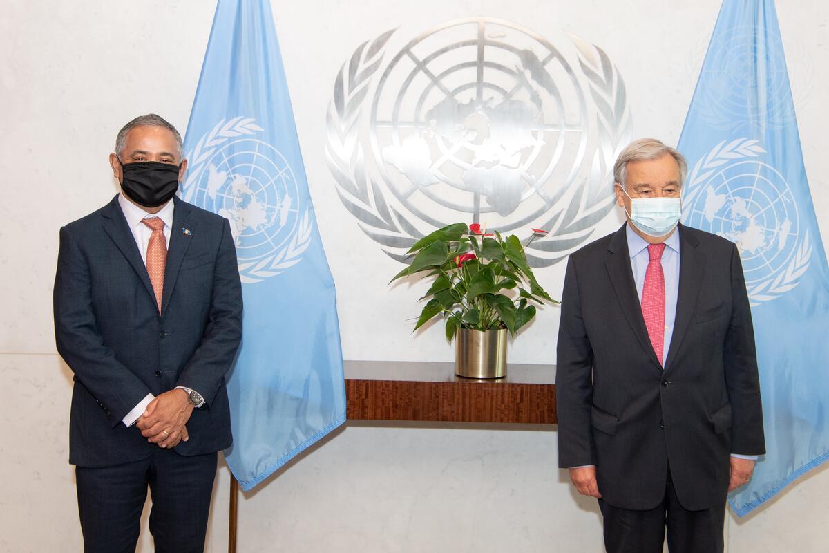 Secretary-General António Guterres (right) meets with John Briceño, Prime Minister of Belize.